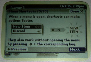 The number of hints provided is interesting. It seems unlikely that new users will want to page through fifteen tips when they first appear. I know I was anxious to try out the Sidekick, not read more instructions. But professional interest won out, so I went through all of them. I quickly lost interest though, as the tips become more obscure, and completely out of context. Until you've had some experience using the Sidekick, for example, the value of a particular shortcut isn't meaningful nor easily remembered.